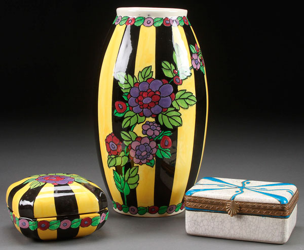 A THREE PIECE GROUP OF CHARLES CATTEAU FOR BOCH FRERES CERAMICS, EARLY 20TH CENTURY. Comprising a lidded box, a 12 inch ovoid vase (D.681), and a hinged box. Each with Boch backstamp.