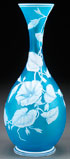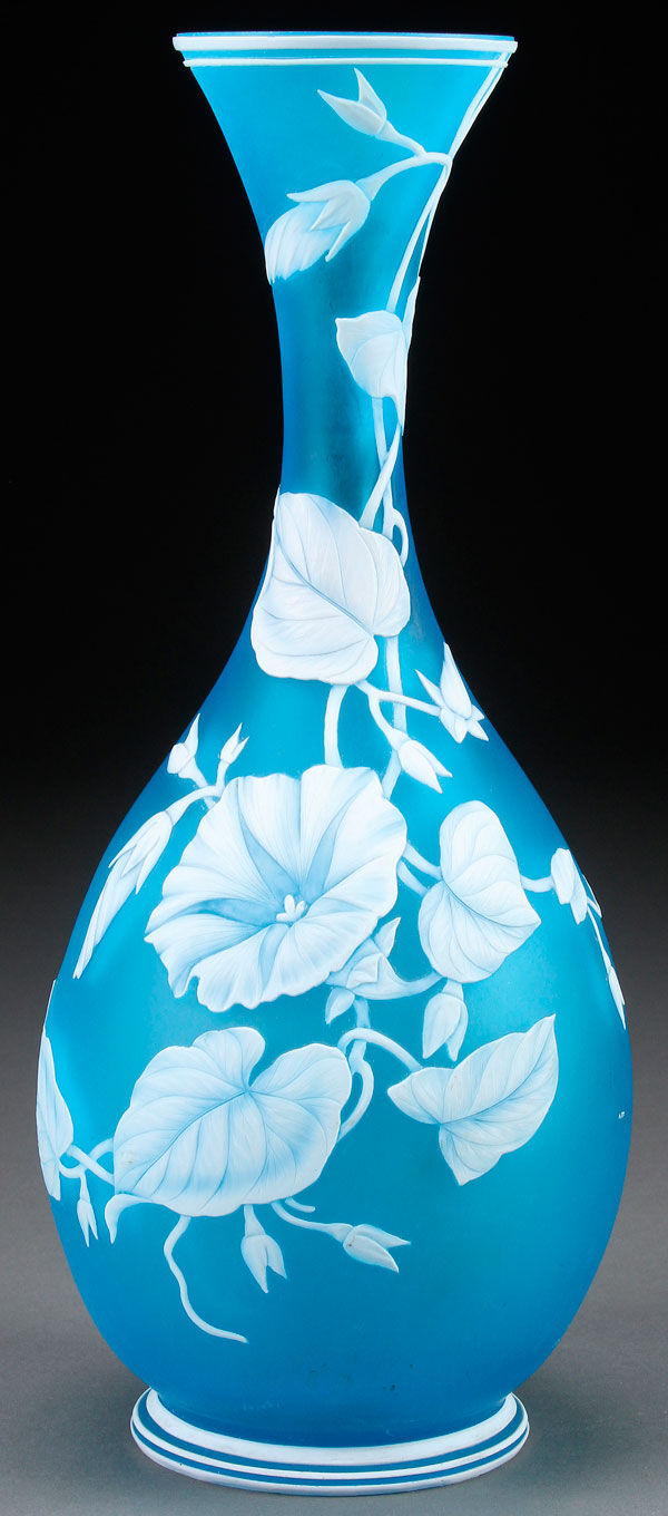 A GOOD ENGLISH CAMEO GLASS VASE, LATE 19TH CENTURY, PROBABLY BY WEBB. Of bottle form in blue glass, overlaid with opaque white and cut with flowering trumpet vines, with two butterflies on verso. Height 12 inches (30.5 cm).