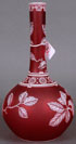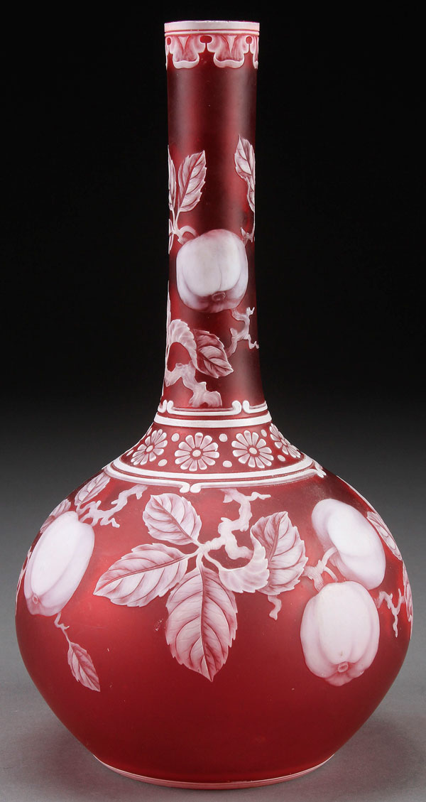 A VERY FINE ENGLISH CAMEO GLASS VASE, LATE 19TH CENTURY. In rose colored glass, overlaid with opaque white and finely cut with apples and leafy branches. Height 11.75 inches (30 cm).