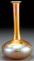 A FINE TIFFANY FAVRILLE ART GLASS VASE, CIRCA 1916. Of bottle form in gold favrille colored glass and decorated with green hearts and vines. Inscribed on base L.C. Tiffany, Favrille, 1043 4110, K. Height 6 inches (15 cm).