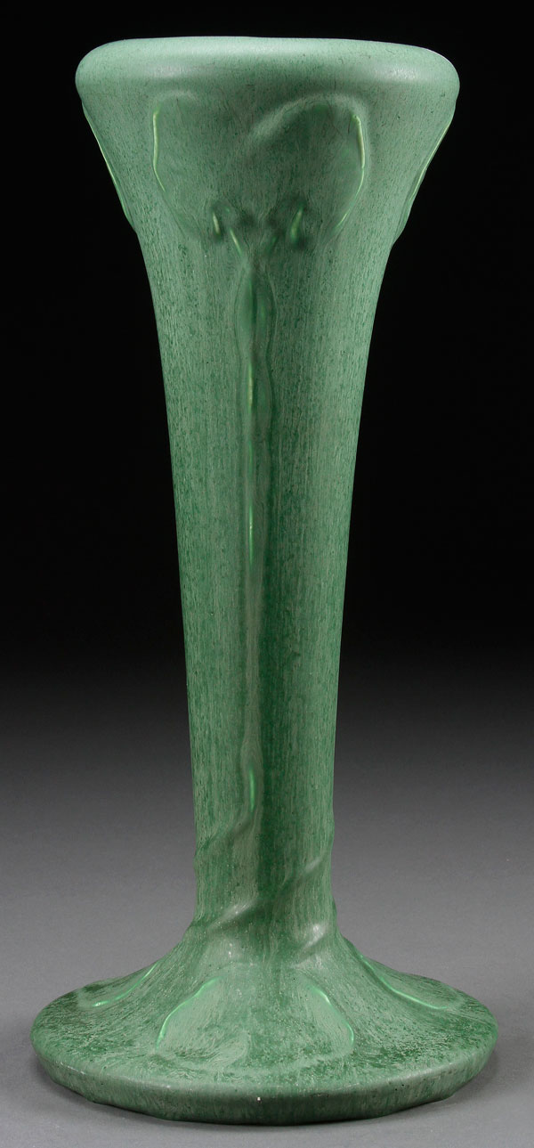 ATTRIBUTED TO HAMPSHIRE POTTERY, AN ARTS AND CRAFTS VASE, CIRCA 1900. With stylized green leaves on elongated stems, under a mottled green glaze. Faint incised circle mark on base. Height 14.5 inches (37 cm).