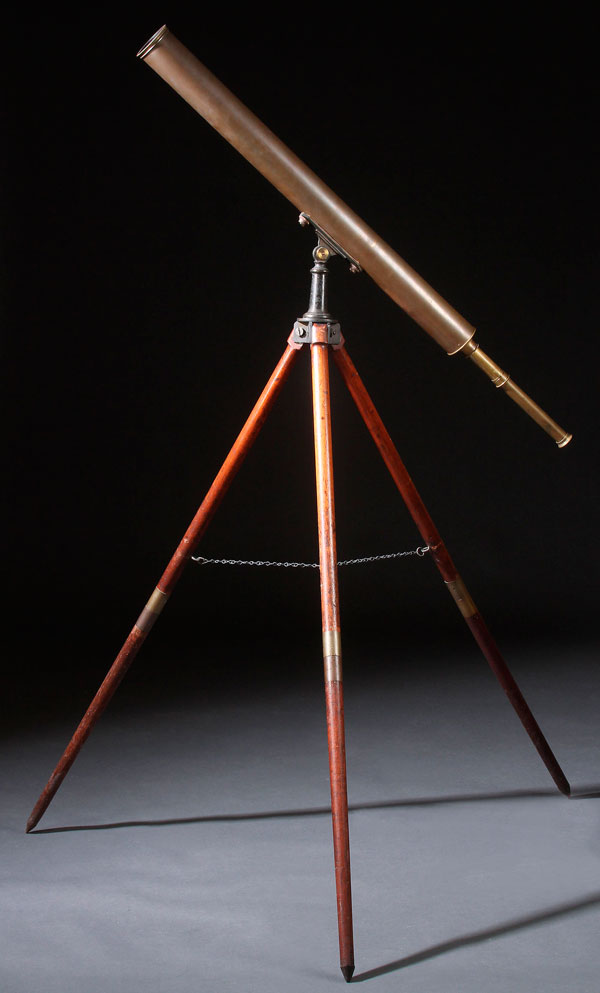A BROADHURST, CLARKSON & CO. ENGLISH 3 INCH REFRACTORY TELECOPE, 19TH CENTURY. With three draw tube, raised on a folding tripod stand. Lot includes four eye pieces (40, 60, 120, and 171 power) and a sun filter. Total length with barrels extended 55 inches (140 cm).