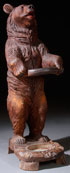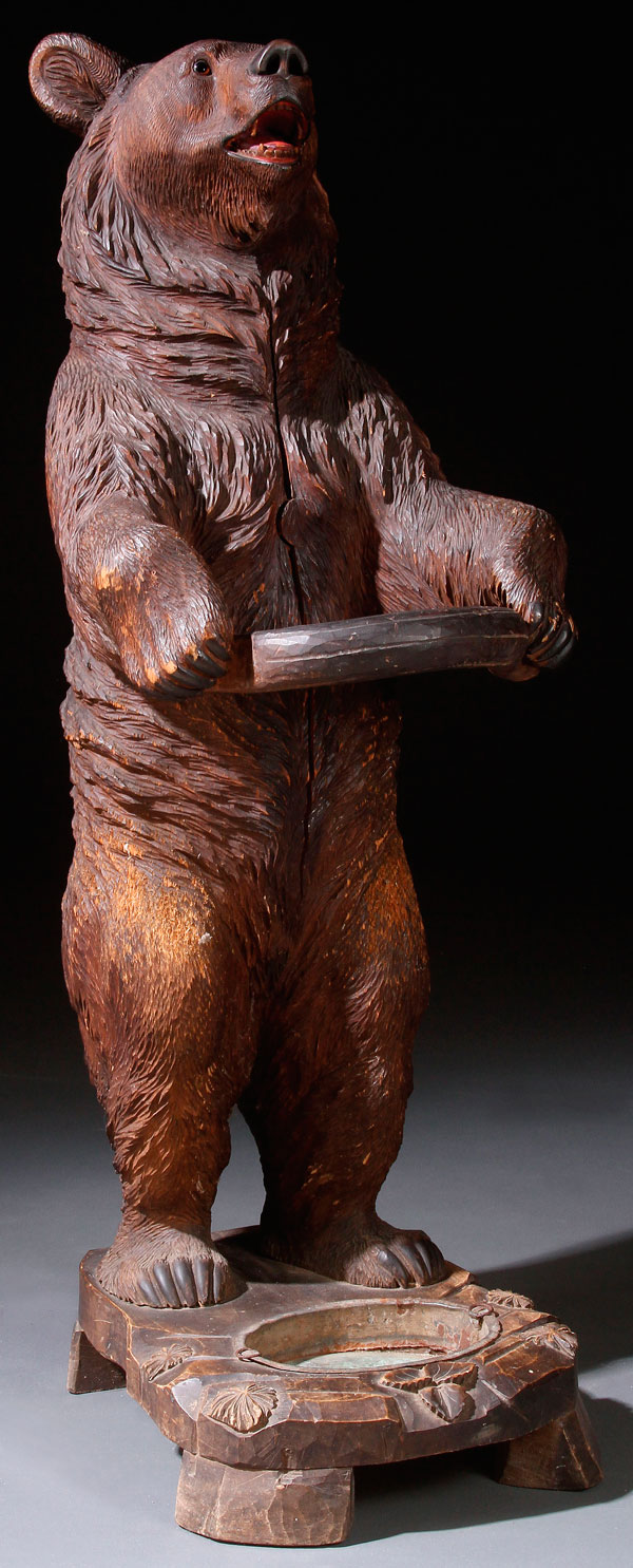 A BLACK FOREST SWISS CARVED BEAR UMBRELLA STAND, CIRCA 1900. Finely carved in full round with glass eyes, open mouth and integral face with copper drip pan. Height 44 inches (111.8 cm).