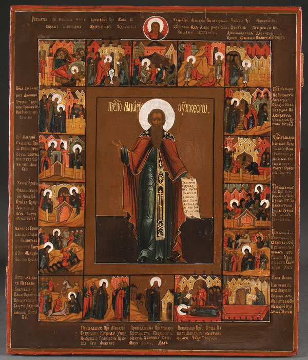 A SCARCE RUSSIAN ICON OF SAINT MAKARIY UNZHENSKIY, 19TH CENTURY. At center the monastic saint is shown full length holding a scroll which begins, "I praise you Lord...and bless [the Savior?] Christ, who has kept us all hitherto in the truth..." He is identified by the gilt inscription flanking his head as The Venerable Unzhenskiy. The borders rendered with 18 different scenes from the life of the saint beginning with his birth (upper left) and concluding with his burial (lower right) and each with corresponding inscriptions identifying each scene. At top center within a medallion the head of Christ. Makariy Unzhenskiy, is also called Makariy of Zheltovodsk (Yellow Water [Lake]) and Unzhensk. 17.5 x 14.75 inches (44.5 x 37.5 cm).