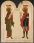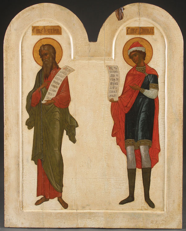 A LARGE AND IMPRESSIVE RUSSIAN ICON OF THE PROPHET EZEKIEL AND DANIEL, MOSCOW, CIRCA 1890. Finely painted and executed in the 16th century style on a double arched panel with deep kovcheg. Likely from the prophet's tier of an iconostasis. 32 inches x 25 inches (80.5 x 64 cm).