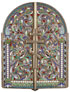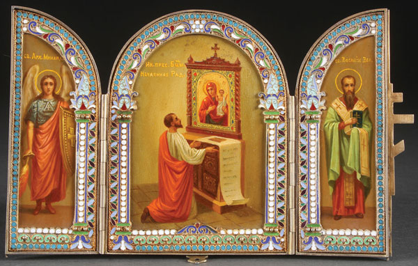 A FINE RUSSIAN SILVER GILT AND ENAMEL PRESENTATION ICON TRIPTYCH PRESENTED TO MAJOR GENERAL VLADIMIR VASILYEVICH ANTIPOV, MOSCOW, 1915. The central arched reserve bordered in cloisonné enamel with side columns and containing an image of the Mother of God of Unexpected Joy. The left wing similarly bordered in enamel and depicting the Archangel Michael and the right wing with Saint Basil (Vasiliy) the Great. The verso with engraved Cyrillic dedicatory inscription, “To our dear Head Master Vladimir Vasilyevich Antipov with the blessings of the gentlemen officers and officials of the Vladimir Military School 1915." The hinged side wings folding over the central panel with an eight-sided cross clasp on verso. Hallmarked St. Petersburg, 1908-1917, and with Cyrillic maker's mark "ГП" probably for silversmith Gregoriy Pankratiev active St. Petersburg 1874-1917, and with 84 silver standard. Height 4.25 inches. Width open 6.6 inches (11 x 17 cm).