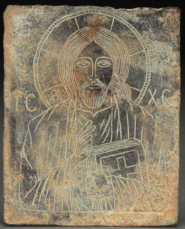 A BRONZE BYZANTINE OR BYZANTINE STYLE ICON OF CHRIST PANTOCRATOR. The slightly concave plate engraved with a waist-up image of Christ who delivers a blessing and holds and open book of Gospels, the surface with green patina. 3.6 inches x 3 inches (9.5 x 7.5 cm).