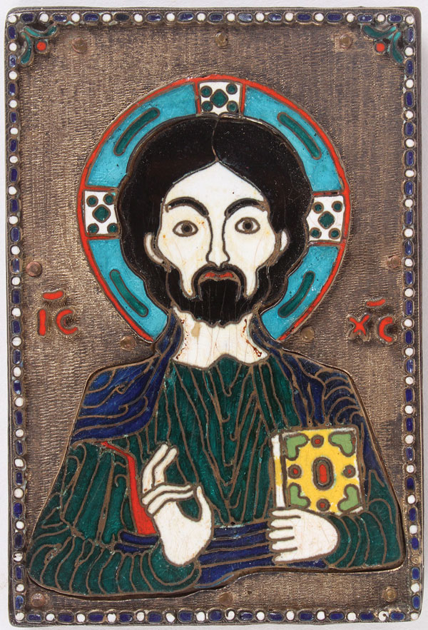 AN ATTRACTIVE SILVER-GILT AND CLOISONNÉ ENAMEL BYZANTINE STYLE ICON OF CHRIST, 20TH CENTURY. Framed within an engraved silver-gilt frame, the face, hands, and garments of Christ rendered in cloisonné as well as the halo and book of Gospels. The outside margins also bordered in enamel and set on a wood panel support. 3.5 inches x 2.4 inches (9 x 6 cm).
