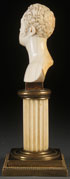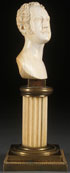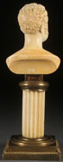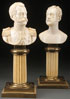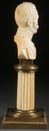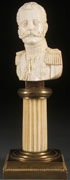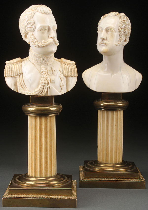A FINE AND IMPORTANT PAIR OF RUSSIAN CARVED IVORY BUSTS OF EMPEROR ALEXANDER II & NICHOLAS I, ATTRIBUTTED TO YAKOV PANFILOVICH SERIAKOV (1818-1869), CIRCA 1855. Each carved in full round of good proportions and likeness with deeply carved hair and fine detailing especially in the uniform and accoutrements of Alexander II. Each resting atop a carved ivory fluted column set in matching bronze stepped bases with leaf-tipped borders. Height of each carved bust approximately 4.7 inches (120 mm). Overall height including bases 10.75 inches (272 mm).