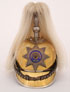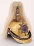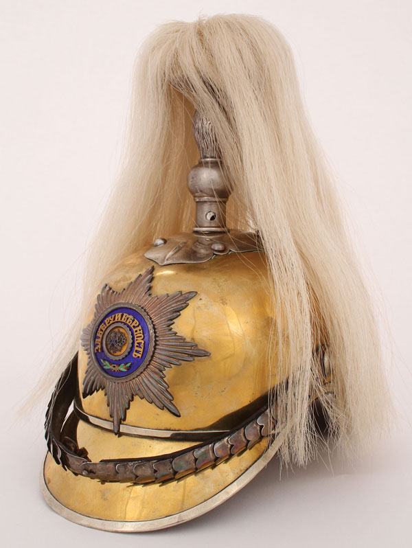 AN IMPERIAL RUSSIAN PERIOD PATTERN 1909 OFFICER'S PARADE HELMET OF HER IMPERIAL MAJESTY EMPRESS MARIA FEODOROVNA’S LIFE-GUARD’S CHEVALIER GUARD CUIRASSIER REGIMENT. The polished tompac body with sloped front visor and lobster-tail rear visor, trimmed in nickel-silver brass. Front mounted with enameled star of St. Andrew the First Called with the motto in gilt letters set on a translucent blue enameled field over and engine-turned ground, For Faith and Loyalty. Surmounted with a silvered service "flaming grenade" finial with white horse hair plume. The round silvered side cockade painted in Romanov colors, silver-plated brass leather-backed chin scales, rear visor lined in red "curtain" type velvet. The front peak lined in black velvet with brown leather sweatband and red moire silk lining. The rim stamped 54 next to the Imperial Warrant and the top of helmet underneath plumed spike with the Cyrillic letter "B" next to the Imperial Warrant and stamped 55. 13 inches (33 cm).