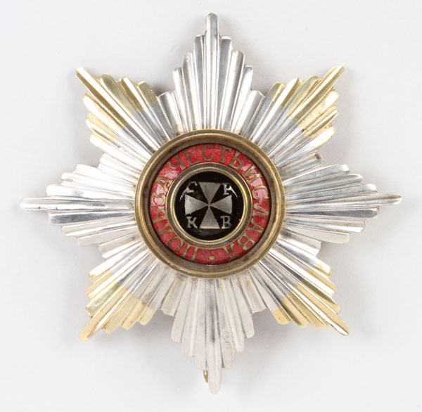 AN IMPERIAL RUSSIAN BREAST STAR FOR THE ORDER OF SAINT VLADIMIR EDUARD, 1908-1917. The eight-pointed star with silver and gilt tips. At center, a silver cross on a black enameled field with the Cyrillic letters CPKB abbreviating святой равноапостольный князь владимир-The Holy Equal-To-The Apostles Prince Vladimir and encircled with the motto of the Order, Benefit, Honor and Glory. The verso with frosted gilt finish, hallmarked Moscow, 1908-1917, Cyrillic maker's mark EDUARD, and with 84 silver standard. 85 mm.