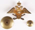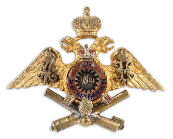 AN IMPERIAL RUSSIAN GILT BRONZE & ENAMEL GRADUATE BADGE FOR THE MIKHAILOVSKY ARTILLERY SCHOOL, ST. PETERSBURG, CIRCA 1910. Gilt, silvered, and enamel bronze double headed Imperial eagle clutching crossed artillery cannons in its talons, the wings with the cypher of Alexander I and Nicholas II and with crown finial. Verso with screw post and original plate and nut, apparently unmarked. 57 mm x 46.5 mm.
