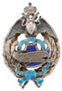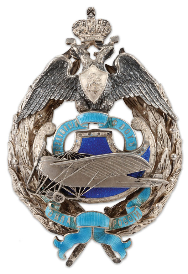 A VERY FINE IMPERIAL RUSSIAN SILVER AND ENAMEL BADGE OF THE COMMITTEE FOR THE STRENGTHENING OF AIR FORCE, ST. PETERSBURG, CIRCA 1912. Within a double laurel wreath is set at center a Greek enameled shield with riveted border upon which is placed a monoplane and above and below a blue enameled ribbon tied at the base and with the words, “AIR FORCE IS THE STRENGTH OF RUSSIA” emblazoned upon it. Above the plane is a crowned double headed Imperial Eagle. Verso of laurel branch stamped with the hallmark for St. Petersburg, circa 1908-1917 and 84 silver standard. On the opposite branch is stamped the Cyrillic initials "ВД" for Vladimir Yakovlev Dinakov, a known supplier to EDUARD. In an excellent state of preservation. Height 70 mm and width 48 mm.