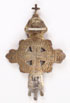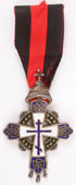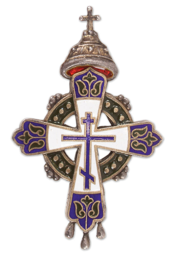 A FINE IMPERIAL RUSSIAN SILVER AND ENAMEL ROMANOV TERCENTENARY CROSS, 6TH ARTLE, MOSCOW 1908-1917. The cross enameled in green, white, blue, and red and surmounted by the ancient Russian Crown of Monomakh. The verso engraved with the initials of the first Romanov sovereign, Mikhail, and the last Nicholas II. Additionally on the base are engraved the years 1613 and 1913. At center within a circular band is engraved to Slavonic expression, "WE RULE THE EMPIRE THROUGH GOD." Verso of cross at top with integral suspension loop mounted over the Russian coat of arms. Hallmarked Moscow, 1908-1917, and maker's mark for the 6th Artel and with 88 silver standard. Remnant of ribbon also remains. Length 2.6 inches (6.5 cm) excluding ribbon.