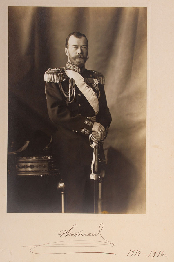 A TSAR NICHOLAS II HAND-SIGNED PHOTO, BOISSONNAS & EGGLER, ST. PETERSBURG, 1916. A fine gelatin silver print photograph of Tsar Nicholas II resting his hands on a sword and behind him on a table a bicorne hat, and below signed in ink "Nicholas" and dated 1914-1916. The mounting embossed lower left "BOISSONNAS ET EGGLER." The photo 8.5 inches x 5.75 inches (21.5 x 14.6 cm). The mounting board 13.5 inches x 9.5 inches (34.5 x 24.5 cm).