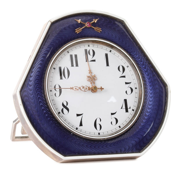 A SPECTACULAR RUSSIAN SILVER AND GUILLOCHE ENAMEL CLOCK, IVAN BRITZEN, ST. PETERSBURG, 1908-1917. The outer border framed in white enamel around a translucent blue enamel field over a moire engine-turned ground. At top, set with crossed arrows mounted with a red cabochon ruby. The central white clock face with black Arabic chapters within a white enameled border.Tthe verso mounted with hinged silver strut and with engraved dedicatory inscription, "To Edward. From Rupert & Gwenny, Xmas 1909." Hallmarked St. Petersburg, 1908-1917, Cyrillic maker's initials "IB" for Ivan Britzen, and 88 silver standard. Height 3.25 inches (8.3 cm).