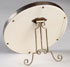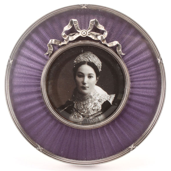 A STRIKING FABERGÉ SILVER AND GUILLOCHE ENAMELED FRAME, MOSCOW, 1899-1908. The ribbon tied reeded border encompassing a translucent amethyst enameled band over a radiating engine-turned ground. The circular aperture with ribbed border and above with ribbon tied finial. The verso with silver scroll strut. Hallmarked Moscow, 1899-1908, and K.FABERGE beneath the Imperial Warrant, and 84 silver standard. Diameter 3.85 inches (9.7 cm).