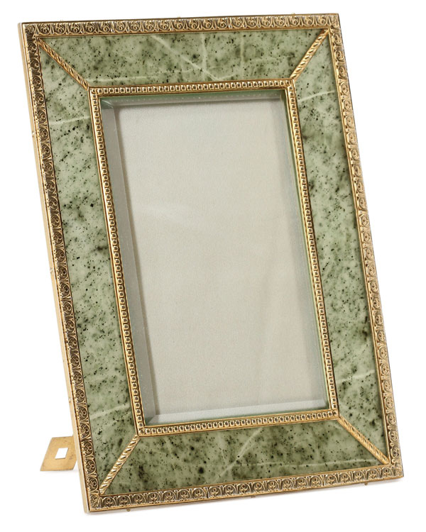 A FABERGÉ SILVER-GILT AND NEPHRITE PICTURE FRAME, MICHAEL PERCHIN, ST. PETERSBURG, CIRCA 1890. The outer edge with repeating tulip head pattern encompassing a polished translucent nephrite border and the joined corners with rope twist braces and with beaded inner aperture set with beveled glass. Verso with integral folding suspension loop and geometric form strut. Hallmarked St. Petersburg, circa 1890, and with Cyrillic workmaster's initials "MP," 84 silver standard, and scratched inventory number 43558. 5.3 inches x 4.1 inches (13.5 x 10.5 cm).