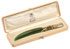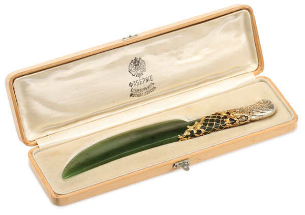 A FABERGÉ TWO-COLORED GOLD MOUNTED NEPHRITE LETTER OPENER, HENRIK WIGSTROM, ST. PETERSBURG, 1899-1908. The polished nephrite blade mounted with overlaid gold lace and scroll decorated pommel in the Louis XVI style. Stamped in Cyrillic "Faberge," workmaster's initials "H.W.," and 56 gold standard. In original Fabergé fitted wood case. Length 5.6 inches (14.5 cm).
