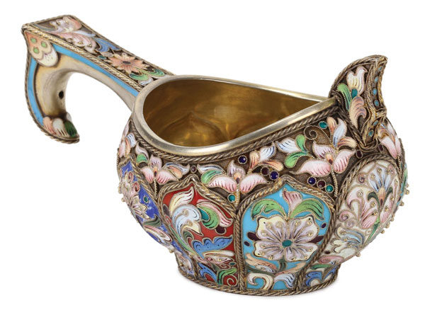 A RUSSIAN SILVER-GILT AND SHADED ENAMELED KOVSH, THIRD ARTEL, ST. PETERSBURG. Of traditional form with hook handle and raised prow, the lobed sides divided by rope-twist borders and enameled with flower forms, embellished with silver beading against a stippled gilt ground. The handle similarly decorated. Hallmarked St. Petersburg, circa 1900, mark of the 3rd Artel, and with 84 silver standard. Length 4.5 inches (11.5 cm).