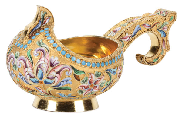 A FINE RUSSIAN SILVER-GILT AND SHADED ENAMEL KOVSH, MOSCOW, 1908-1917. Of traditional form resting on a slightly flared circular base with substantial hook handle and raised prow. Overall with shaded enameled florals on a stippled gilt ground and turquoise blue, cloisonné enameled borders. Hallmarked Moscow, 1908-1917, and Cyrillic maker's mark "P.F." Length 4.25 inches (10.7 cm).