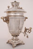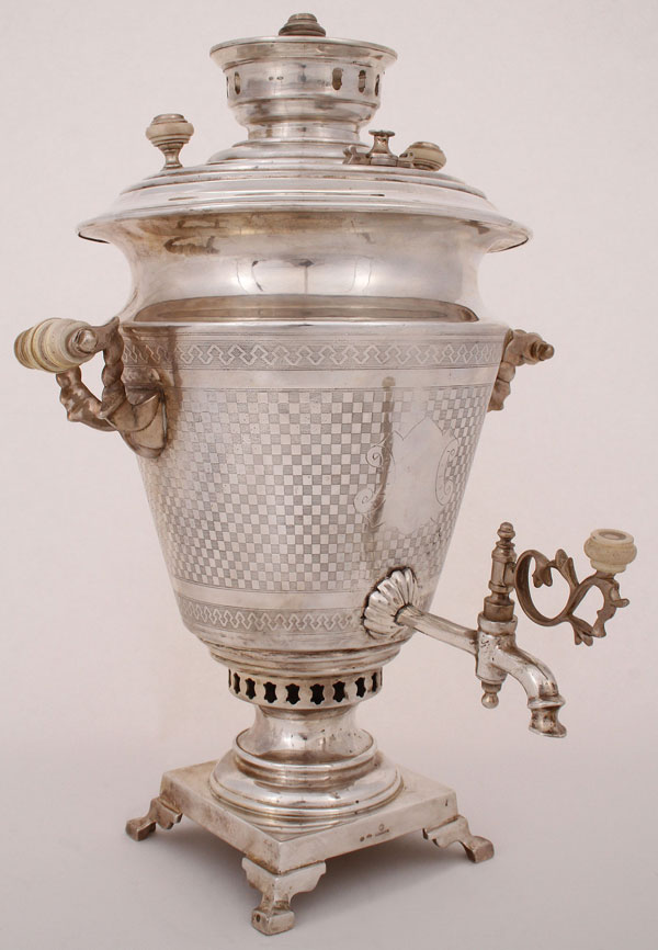 A LARGE RUSSIAN SILVER SAMOVAR, OVCHINNIKOV, MOSCOW, 1899-1908. Resting on a square pedestal base supported by four bracket feet upon which rests the tapered cylindrical reservoir with the front engraved with a blank shield cartouche above a substantial shaped silver spigot. The body overall machine-engraved with a checkered pattern with bands at the top and bottom of repeating geometric forms. The sides mounted with sturdy handles. Hallmarked Moscow, 1899-1908, and Cyrillic maker's mark "P.OVCHINNIKOV" under the Imperial Warrant. Height 18.75 inches (47.5 cm). Gross weight 158.15 troy oz.