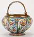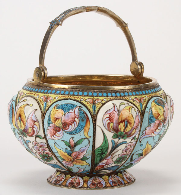 A RUSSIAN SILVER-GILT AND SHADED ENAMELED SUGAR BOWL, MOSCOW, 1899-1908. Resting on a slightly flared circular foot banded in enameled florals, the sides lobed and each depicting a colorful flower form against a robin egg's blue or white ground. The rim and base beaded in turquoise cloisonné enamel and the swivel handle also with cloisonné enamel. Hallmarked Moscow, 1899-1908, indistinguishable Cyrillic maker's mark, and 84 silver standard. Width 4.5 inches (11.5 cm). Height 5 inches (12.7 cm).