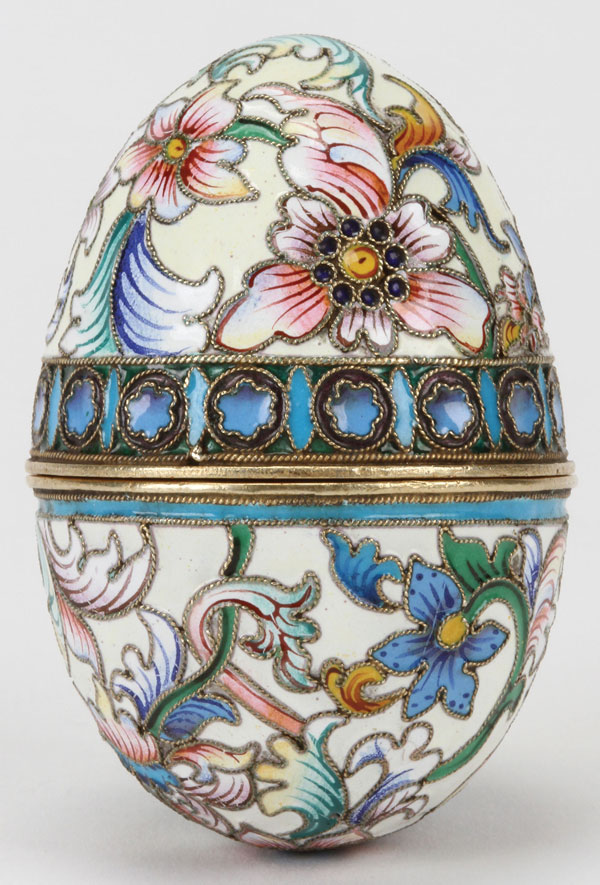A SILVER-GILT AND SHADED ENAMELED EASTER EGG, 20TH CENTURY. The two-piece egg overall decorated with floral forms on a cream ground and the middle with a band of flower heads. The interior brightly gilded and stamped S925. Probably Russian and probably 20th century, although apparently unmarked. Length 2.4 inches (6 cm).