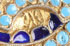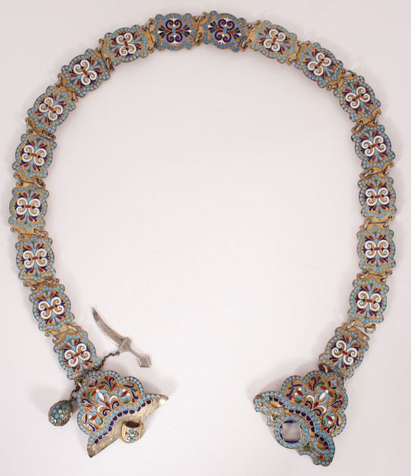 A RUSSIAN SILVER-GILT AND CLOISONNÉ ENAMELED BELT, GUSTAV KLINGERT, MOSCOW, 1899-1908. Comprising 18 silver-gilt and cloisonné enameled shield shaped plates each linked with silver rings and attached on both ends to the two-piece belt plate with kindjal style fastener and enameled lavaliere egg pendant. Overall length 26 inches (66 cm).