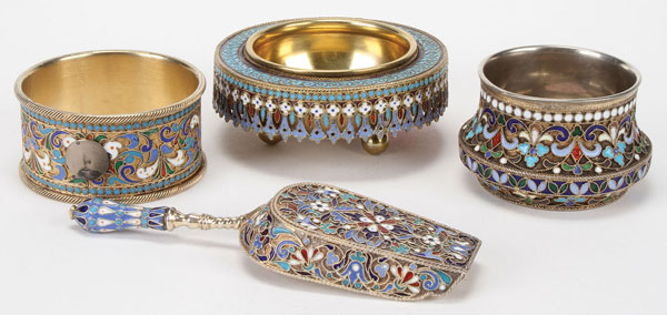 A GROUP OF FOUR RUSSIAN SILVER-GILT AND ENAMELED ITEMS, MOSCOW, 1888-1917. Comprising a silver-gilt and cloisonné enameled napkin ring with rope-twist border, a large silver mastersalt resting on three ball feet with overhanging reticulated enameled border and brightly gilded interior, another silver-gilt and cloisonné enameled mastersalt on a stippled gilt ground with white beaded border, and a heavily enameled silver sugar scoop. Each hallmarked Moscow and with various Cyrillic maker's marks. Greatest length 4.5 inches (11 cm).