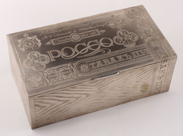 A LARGE RUSSIAN SILVER GILT TROMPE L'OEIL CIGAR BOX, MOSCOW, 1908-1917. The rectangular form with hinged lid, the sides engraved with simulated wood grain, the lid and sides also engraved with banding depicting labels, and displaying various awards, including numerous Imperial double-headed eagles. The brightly gilded interior engraved with dedicatory inscription and with foreign import marks. Hallmarked Moscow, 1908-1917, Cyrillic maker's mark A.F within an oval cartouche, probably for Alexander Fuld, and with 84 silver standard. Length 7.5 inches (19 cm). Width 4 inches (10.2 cm). Height 2.6 inches (6.8 cm). Total weight 14.96 troy oz.