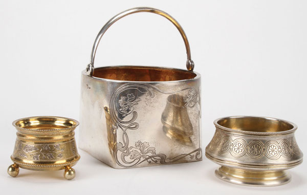 A THREE-PIECE RUSSIAN SILVER GROUP, MOSCOW, 1884-1908. Comprising a silver-gilt footed salt with engraved sides, beaded rim, and rope-twist banding. Engraved with dedicatory date of October 1898 and indistinguishable Cyrillic maker's mark and a large mastersalt on slightly flared ring foot, banded with flower heads, and rope-twist rim. Dated 1884 and with indistinguishable maker's marks. Together with a large silver sugar bowl with Art Nouveau style engraved flowers, swivel handle, and brightly gilded interior. With Cyrillic maker's mark AF. Each piece hallmarked Moscow and 84 silver standard. Greatest height 4.75 inches (12 cm).