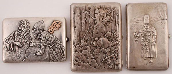 THREE RUSSIAN SILVER CIGARETTE CASES, MOSCOW AND ST. PETERSBURG, 1899-1917. The first depicting a bogatyr in the company of a gypsy fortune teller on the hinged lid set with gilt initials, with cabochon thumb piece opening to reveal a gilded interior with dedicatory inscription dated October 20, 1917, and with St. Petersburg hallmarks, 1899-1908, and 84 silver standard. Length 4.4 inches (11.2 cm). The next with a group of hunters in the woods on the hinged lid, opening to reveal a brightly gilded interior with Moscow hallmark, 1908-1917, Cyrillic maker's mark GR, and 84 silver standard. Length 4.75 inches (12 cm). The last depicting a boyar holding cattails in a spring landscape on the front hinged lid and the back overall enameled in cloisonné on a stippled ground with turquoise beaded border. Cabochon thumb piece opening to reveal an interior hallmarked Moscow, 1908-1917, with maker's mark for the 12th Artel (12A), and 84 silver standard. Length 4.75 inches (12 cm).