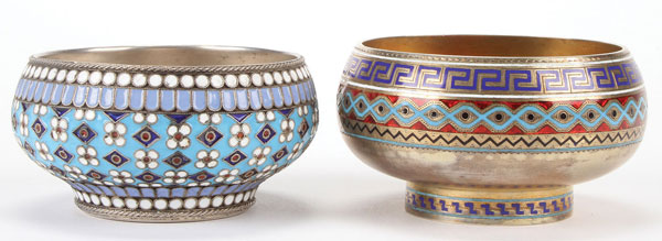 A PAIR OF RUSSIAN SILVER AND ENAMELED MASTERSALTS, CIRCA 1890. The first in cloisonné enamel with white beaded borders. Hallmarked Moscow, Cyrillic maker's mark BA for Vasily Agafonov, and 84 silver standard. The second resting on a raised ringed foot and banded in champlevé enamel of repeating patterns. The interior gilded. Hallmarked St. Petersburg, Cyrillic maker's mark AB for Andre Bragin, 88 silver standard, and with later Soviet control marks. Greatest width 2.75 inches (7 cm).
