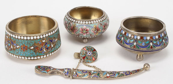 A FOUR-PIECE RUSSIAN SILVER AND ENAMELED GROUP, MOSCOW, CIRCA 1900. Comprising a salt on slightly flared ringed foot with cloisonné enameled sides and white enameled beaded borders, shaded enamel salt on ball feet with white beaded border, a cloisonné enameled salt on ball feet, and a pendant-form enameled miniature kindjal. Each hallmarked Moscow, with 84 silver standard, and each with various maker's marks. Greatest length 4 inches (10 cm). (Unillustrated)