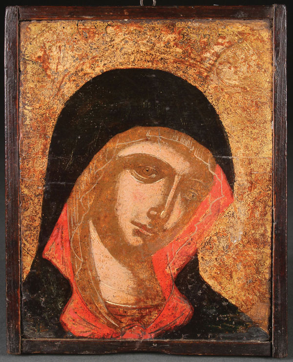 A VENITO-CRETAN ICON FRAGMENT OF THE MOTHER OF GOD, CIRCA 1600. Wearing a transparent veil and a deep blue and red maphorion and the halo punched with decorative scrolls. 8.1 inches x 6.4 inches (20.8 x 16.4 cm).