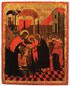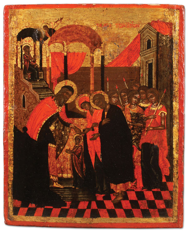 A NORTHERN GREEK ICON OF THE HOLY OF HOLIES, AROUND 1600. The offered icon illustrates the subject of the “Entrance of the Mother of God into the Temple” and this is the standard title for this subject. However, in this example an alternative and less frequently used title is clearly inscribed in Greek on the upper margin, TA HAGIA TON AGION, meaning the Holy of Holies. It, of course, refers both to the most sacred part of the temple as well as to Mary as the "new" temple that is to contain Christ, the "Holy of Holies." The offered lot is a fine example of the provincial post-Byzantine tradition of icon painting in which painters had models of older icons to follow. 18.5 inches x 14.75 inches (47 x 37.5 cm).