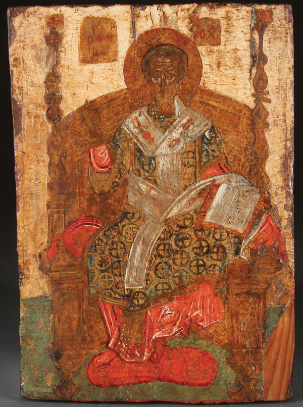 A GREEK ICON OF A BISHOP SAINT, 17TH/18TH CENTURY. Depicted enthroned, delivering a blessing, and holding an open book of Gospels. 12.6 inches x 9 inches (32 x 23 cm).