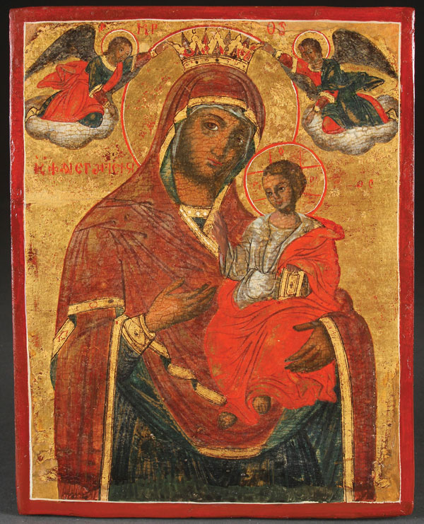 A NORTHERN GREEK ICON OF THE MOTHER OF GOD, AROUND 1800. Colorfully painted on a gilt ground. 11 inches x 8.5 inches (28 x 21.5 cm).