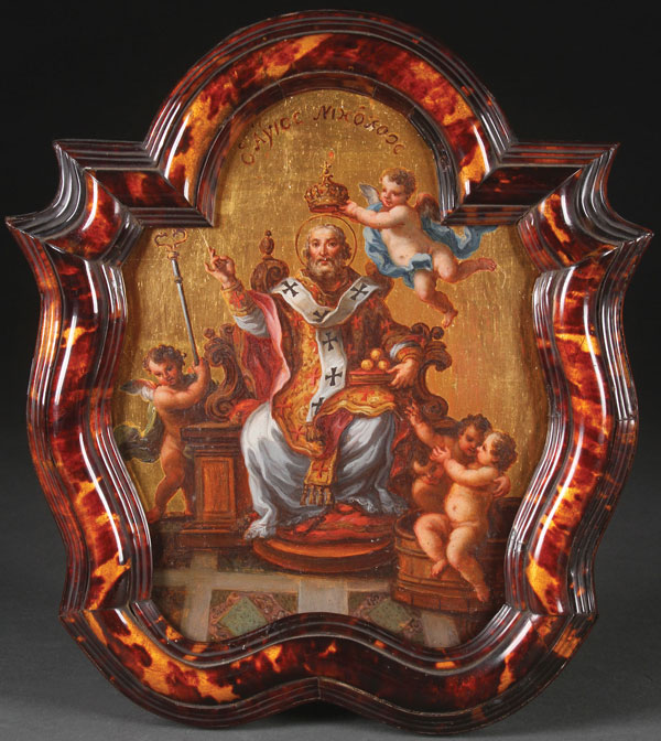AN INTERESTING GREEK ICON OF ST. NICHOLAS, 19TH CENTURY. Realistically rendered on a gilt shaped wood panel and contained in an ornate faux tortoise shell frame. 13 inches x 11.5 inches (32.5 x 29.5 cm).