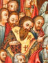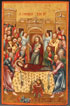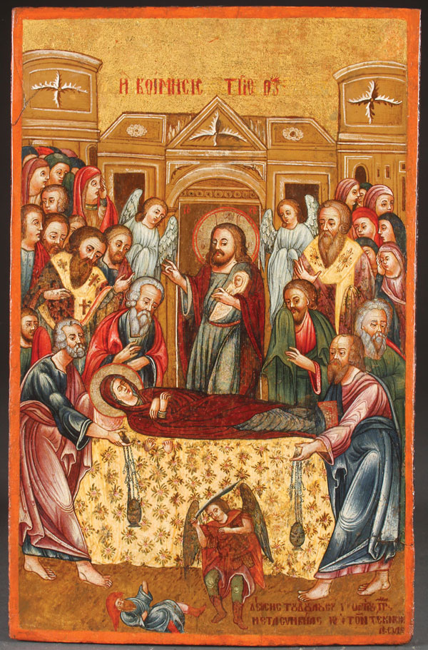 A NORTHERN GREEK OR MACEDONIAN ICON OF THE DORMITION, 18TH CENTURY. Colorfully painted, here the Mother of God reclines on the funeral bier as Christ receives her soul depicted as a swaddled infant, and as the Apostles and others look on. Indistinctly inscribed lower right, "Prayer of the servant of God Georgios ****** with his wife and children." Dated 1739? 18.8 inches x 12 inches (48 x 30.5 cm).