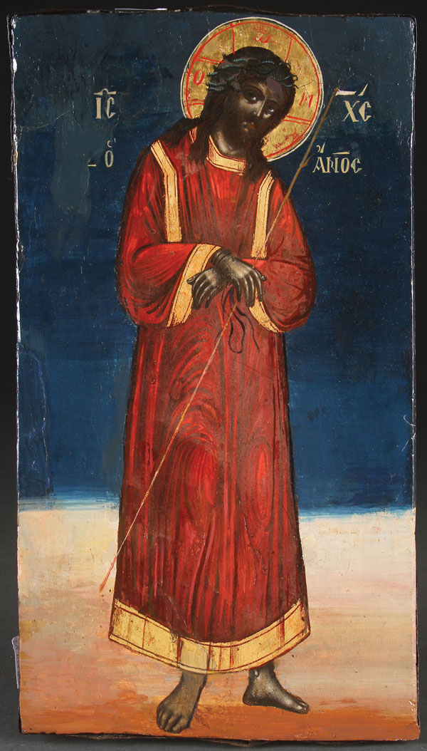 A NORTHERN GREEK ICON OF ECCE HOMO, 18TH CENTURY. 14.25 inches x 8 inches (36 x 20 cm).