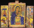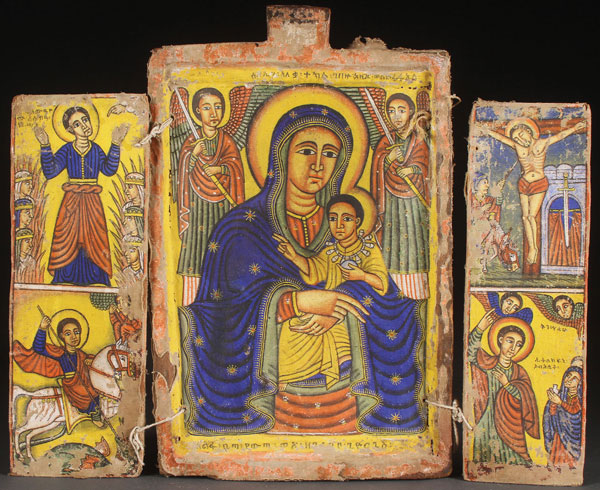AN IMPRESSIVE ETHIOPIAN ICON TRIPTYCH, 19TH CENTURY. Executed in bright colors on woven cloth mounted to wood supports. At center the Mother of God flanked by two angels and the wings with various images including St. George Slaying the Dragon and the Crucifixion. 16.2 inches x 19.3 inches (41 x 49.5 cm) open.