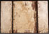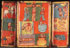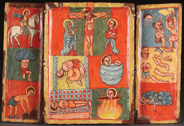 AN ETHIOPIAN ICON TRIPTYCH, 19TH CENTURY. Executed in egg temepra on gessoed wood panel, the central section divided into three registers, the top with the Crucifixion and the lower margin and wings apparently depicting the martyrdom of a saint. Verso inscribed in Coptic? 9.5 inches x 14.1 inches (24 x 36 cm) open.