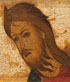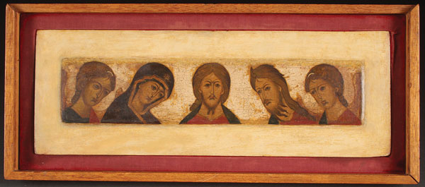 A RUSSIAN ICON OF THE DIESIS IN THE 17TH CENTURY STYLE. The small rectangular panel with Christ at center flanked by the Mother of God and the Archangel Gabriel on the left and St. John the Forerunner and the Archangel Mikhail on right. Set in a velvet lined frame. The verso with label of Hammer Galleries for Exhibition of Russian Icons organized by Hammer Galleries, August 2nd to August 31st 1937, New York, No. 179. Size: 5 inches x 14 inches (13 x 35.5 cm).