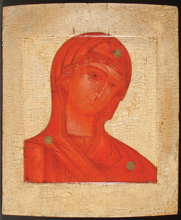 A RUSSIAN ICON OF THE FIERY VISAGE MOTHER OF GOD, 18TH CENTURY. The time and place of origin of this icon type are unknown. One might hazard a guess that the fiery visage may relate to the description of Mary as "The unconsumed thornbush, the bush which Moses saw burning, yet not consumed by fire, just as Mary is believed to have carried God within her womb, yet had not been touched." The borders and background cleaned down to gesso. 14 inches x 11.75 inches (35.5 x 30 cm).