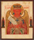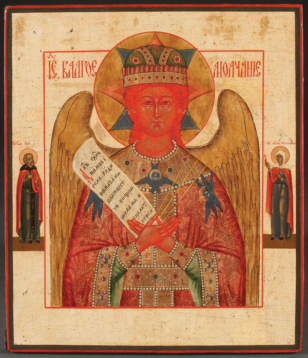 A RUSSIAN ICON OF THE BLESSED SILENCE, CIRCA 1800. Here Christ is depicted as an angel with an eight-pointed "Glory" imposed on the halo the eighth point being hidden by the head. The seven points symbolize the six days of creation and the day on which God rested, the eighth point is the day of eternity. The borders with two family saints. 13 inches x 11.25 inches (33.2 x 28.6 cm).