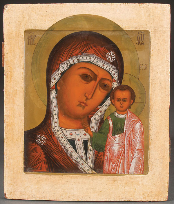 A RUSSIAN ICON OF THE KAZAN MOTHER OF GOD, MOSCOW, CIRCA 1900. Finely painted in the Revivalist style, the borders cleaned down to the gesso. 12.4 inches x 10.5 inches (31.5 x 26.5 cm).