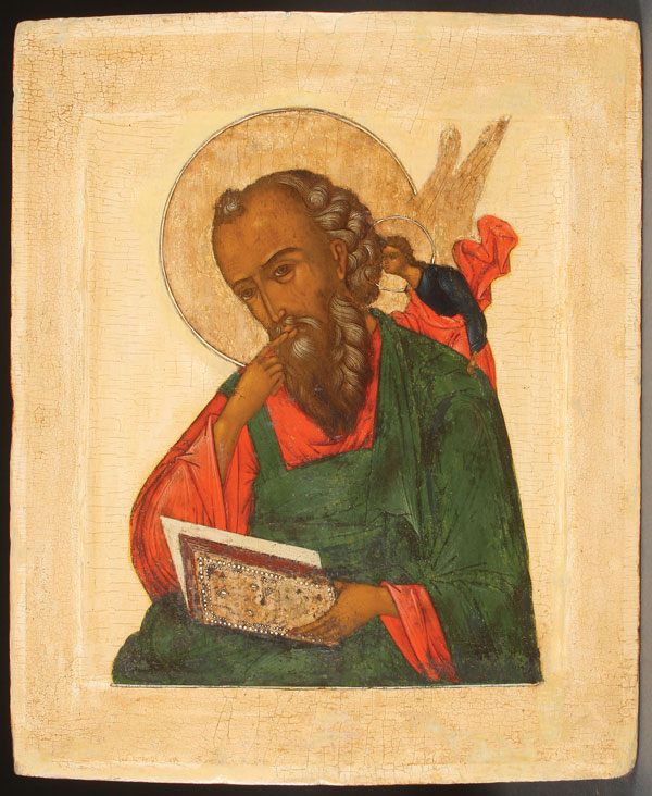 A RUSSIAN ICON OF ST. JOHN THE THEOLOGIAN, PROBABLY 18TH CENTURY. Here John contemplates writing his Gospel as an angel of the Lord whispers inspiration into his ear. The borders and background cleaned down to the gesso. 11 inches x 9.4 inches (28 x 23.5 cm).