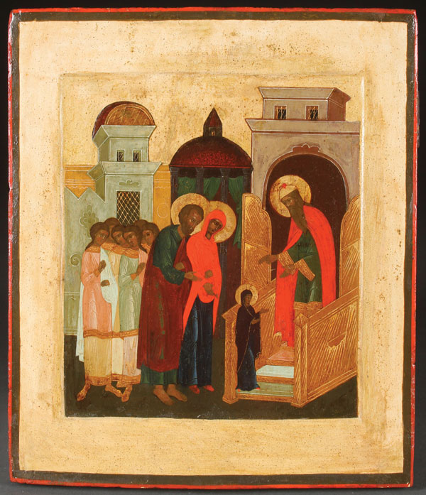 A RUSSIAN ICON OF THE ENTRANCE OF THE MOTHER OF GOD INTO THE TEMPLE, MOSCOW, CIRCA 1890. Faithfully following 16th century canons made popular at the end of the 19th century. The borders and background cleaned down to the gesso. 12.4 inches x 10.6 inches (31.5 x 27 cm).
